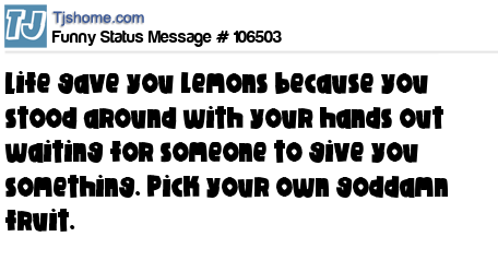 - # 7487 Sometimes when life hands you lemons you just need to take those lemons and throw them back in life's face and say "How dare you!!! Don't come back here till you have some oranges or at least a pretty good sized grapefruit!"