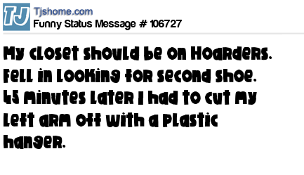 X is My closet should be on Hoarders. Fell in looking for second shoe. 45 minutes later I had to cut my left arm off with a plastic hanger.