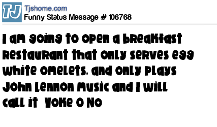 X is I am going to open a breakfast restaurant that only serves egg white omelets, and only plays John Lennon music and I will call it “Yoke O No”