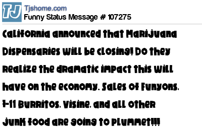 X is California announced that Marijuana Dispensaries will be closing! Do they realize the dramatic impact this will have on the economy. Sales of Funyons, 7-11 Burritos, Visine, and all other junk food are going to plummet!!!