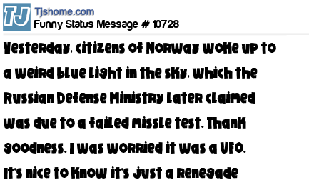 X Yesterday, citizens of Norway woke up to a weird blue light in the sky, which the Russian Defense Ministry later claimed was due to a failed missle test. Thank goodness. I was worried it was a UFO. It's nice to know it's just a renegade Russian missle.
