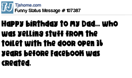 X Happy birthday to my Dad,,,, who was yelling stuff from the toilet with the door open 36 years before Facebook was created.