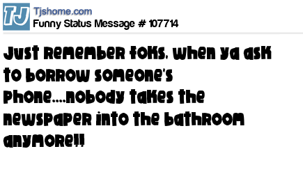 X is Just remember foks, when ya ask to borrow someone's phone....nobody takes the newspaper into the bathroom anymore!!