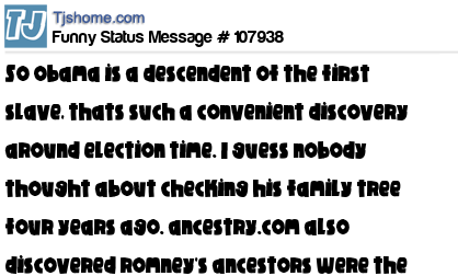 X So obama is a descendent of the first slave, thats such a convenient discovery around election time. I guess nobody thought about checking his family tree four years ago. ancestry.com also discovered romney's ancestors were the first slave owners..