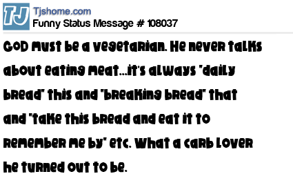 X G0D must be a vegetarian. He never talks about eating meat...it's always "daily bread" this and "breaking bread" that and "take this bread and eat it to remember me by" etc. What a carb lover he turned out to be.
