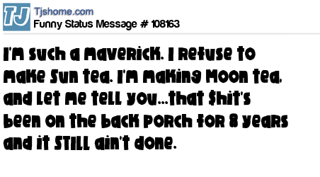 X I'm such a maverick. I refuse to make Sun tea. I'm making Moon tea, and let me tell you...that $hit's been on the back porch for 8 years and it STILL ain't done.