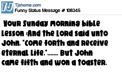 X says Your Sunday morning bible lesson :And the Lord said unto John, "Come forth and receive eternal life."....... But John came fifth and won a toaster.