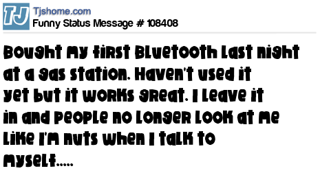 X is Bought my first Bluetooth last night at a gas station. Haven't used it yet but it works great. I leave it in and people no longer look at me like I'm nuts when I talk to myself.....