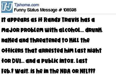 X is it appears as if Randy Travis has a major problem with alcohol... drunk, naked and threatened to kill the officers that arrested him last night for DUI... and a public intox. last Feb.? Wait, is he in the NBA or NFL???