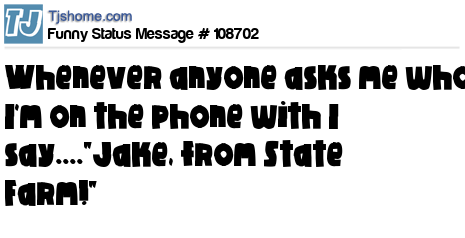 X Whenever anyone asks me who I'm on the phone with I say...."Jake, from State Farm!"