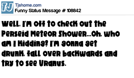 X Well, I'm off to check out the Perseid Meteor Shower...Oh, who am I kidding? I'm gonna get drunk, fall over backwards and try to see Uranus.