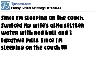 - # 109032 Since I'm sleeping on the couch, Switced my wife's alka seltzer water with red bull and 2 laxative pills!!! Her shittz going to fly!