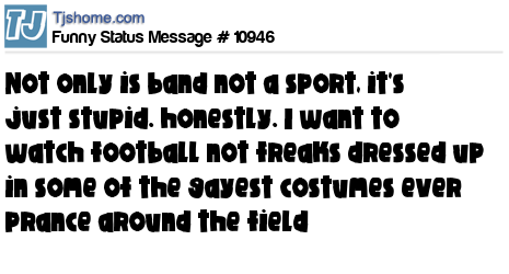X not only is band not a sport, it's just stupid. honestly. I want to watch football not freaks dressed up in some of the gayest costumes ever prance around the field