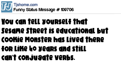 X says You can tell yourself that Sesame Street is educational but Cookie Monster has lived there for like 40 years and still can't conjugate verbs.