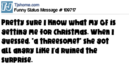 X is Pretty sure I know what my GF is getting me for Christmas. When I guessed, "a threesome?" she got all angry like I'd ruined the surprise.