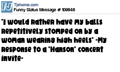 X "I would rather have my balls repetitively stomped on by a woman wearing high heels" -My response to a "Hanson" concert invite-