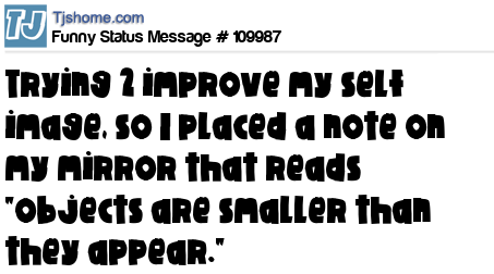 X Trying 2 improve my self image, so I placed a note on my mirror that reads "objects are smaller than they appear."