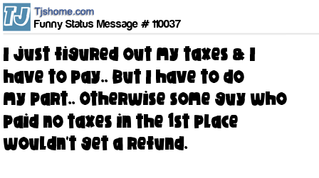X I just figured out my taxes & I have to pay.. But I have to do my part.. Otherwise some guy who paid no taxes in the 1st place wouldn't get a refund.