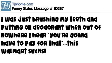 - # 110453 Just brushing my teeth & putting on deodorant when out of nowhere I hear, "You're going to have to pay for that!" This Wal-Mart sucks.