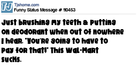 X is Just brushing my teeth & putting on deodorant when out of nowhere I hear, "You're going to have to pay for that!" This Wal-Mart sucks.