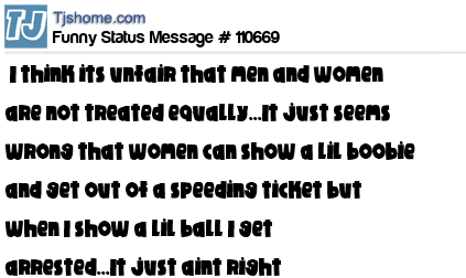 - # 70698 I think its unfair that men and women are not treated equally...It just seems wrong that women can show a lil boobie and get out of a speeding ticket but when I show a lil ball I get arrested...It just aint right