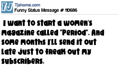 - # 63287 wants to start a women's magazine called "Period". And some months I'll send it out late just to freak out my subscribers.