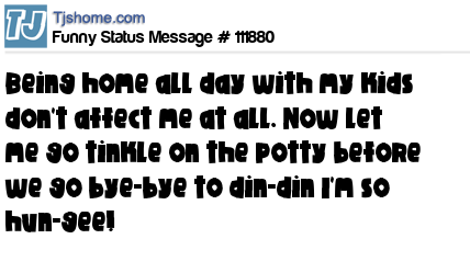 X says being home all day with my kids don't affect me at all. Now let me go tinkle on the potty before we go bye-bye to din-din I'm so hun-gee!