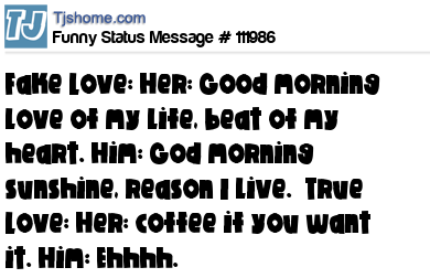 X Fake Love: Her: Good morning love of my life, beat of my heart. Him: God morning sunshine, reason I live. True Love: Her: coffee if you want it. Him: Ehhhh.