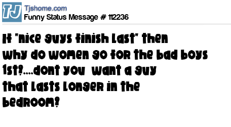 X says if "nice guys finish last" then why do women go for the bad boys 1st?....dont you want a guy that lasts longer in the bedroom?