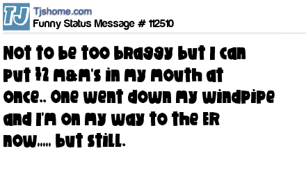 X Not to be too braggy but I can put 72 m&m's in my mouth at once.. One went down my windpipe and I'm on my way to the ER now,,,,, but still.