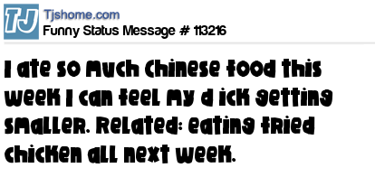 X says I ate so much Chinese food this week I can feel my d ick getting smaller. Related: eating fried chicken all next week.