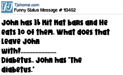 X John has 36 kit kat bars and He eats 30 of them. What does that leave John with?........................ Diabetus,, John has "The diabetus."