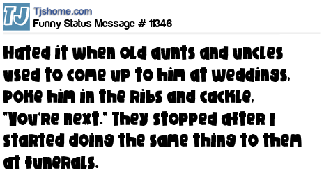 - # 9535 hated it when old aunts used to come up to her at weddings, poke her in the ribs and cackle, "You're next." They stopped after I started doing the same thing to them at funerals.