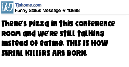 X says There's pizza in this conference room and we're still talking instead of eating. THIS IS HOW SERIAL KILLERS ARE BORN.