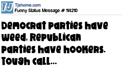 X says Democrat parties have weed, Republican parties have hookers. Tough call...