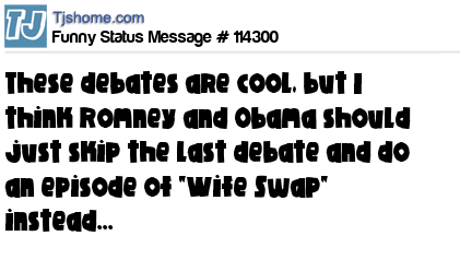 X says These debates are cool, but I think Romney and Obama should just skip the last debate and do an episode of "Wife Swap" instead...