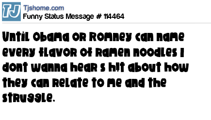 X is until Obama or Romney can name every flavor of ramen noodles I dont wanna hear s h!t about how they can relate to me and the struggle.