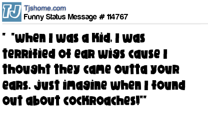 X ""when I was a kid, I was terrified of ear wigs cause I thought they came outta your ears. just imagine when I found out about cockroaches!""