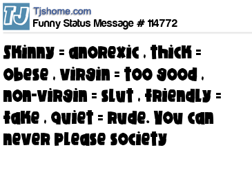 - # 149313 Skinny = anorexic , thick = obese , virgin = too good , non-virgin = slut , friendly = fake , quiet = rude. You can never please society