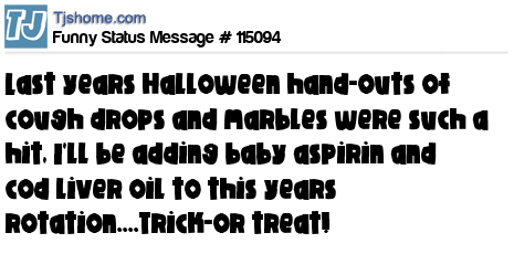 X Last years Halloween hand-outs of cough drops and marbles were such a hit, I'll be adding baby aspirin and cod liver oil to this years rotation....Trick-or treat! ツ