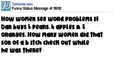 X says How women see word problems If Dan buys 6 pears, 4 apples & 5 oranges. How many women did that son of a b itch check out while he was there?
