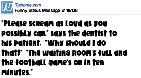 X "Please scream as loud as you possibly can," says the dentist to his patient. "Why should I do that?" "The waiting room's full and the football game's on in ten minutes."