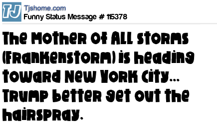 X The Mother Of All storms (Frankenstorm) is heading toward New York City... Trump better get out the hairspray.