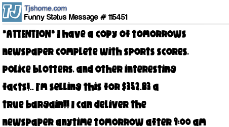 X is *ATTENTION* I have a copy of tomorrows newspaper complete with sports scores, police blotters, and other interesting facts!.. I'm selling this for $352.83 a true bargain!! I can deliver the newspaper anytime tomorrow after 9:00 am