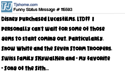 X Disney purchased Lucasfilms, LTD?? I personally can't wait for some of those gems to start coming out. Particularly, Snow White and the Seven Storm Troopers, Swiss Family Skywalker and - my favorite - Song of the Sith...