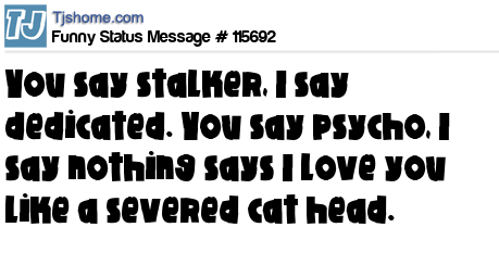 X says You say stalker, I say dedicated. You say psycho, I say nothing says I love you like a severed cat head.