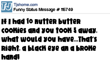X If I had 10 nutter butter cookies and you took 5 away, what would you have...That's right, a black eye an a broke hand!