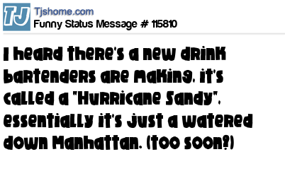X I heard there's a new drink bartenders are making, it's called a "Hurricane Sandy", essentially it's just a watered down Manhattan. (too soon?)