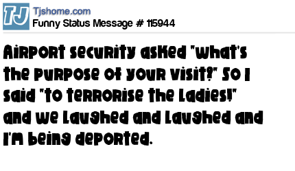 X says Airport security asked "what's the purpose of your visit?" So I said "to terrorise the ladies!" and we laughed and laughed and I'm being deported.