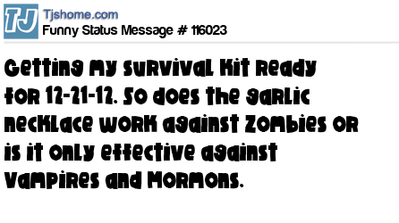 X was Getting my survival kit ready for 12-21-12. So does the garlic necklace work against Zombies or is it only effective against Vampires and Mormons.